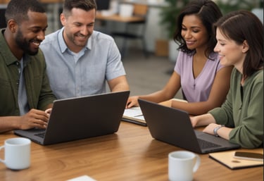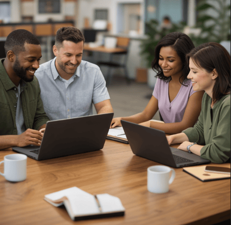 An inviting team workspace featuring a small group collaborating and sharing ideas.